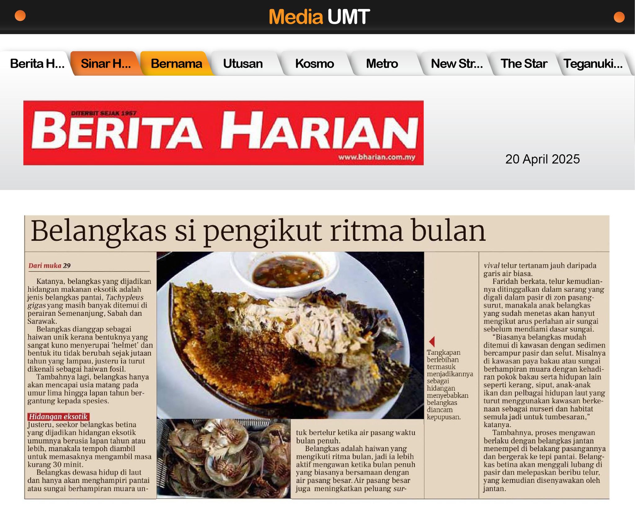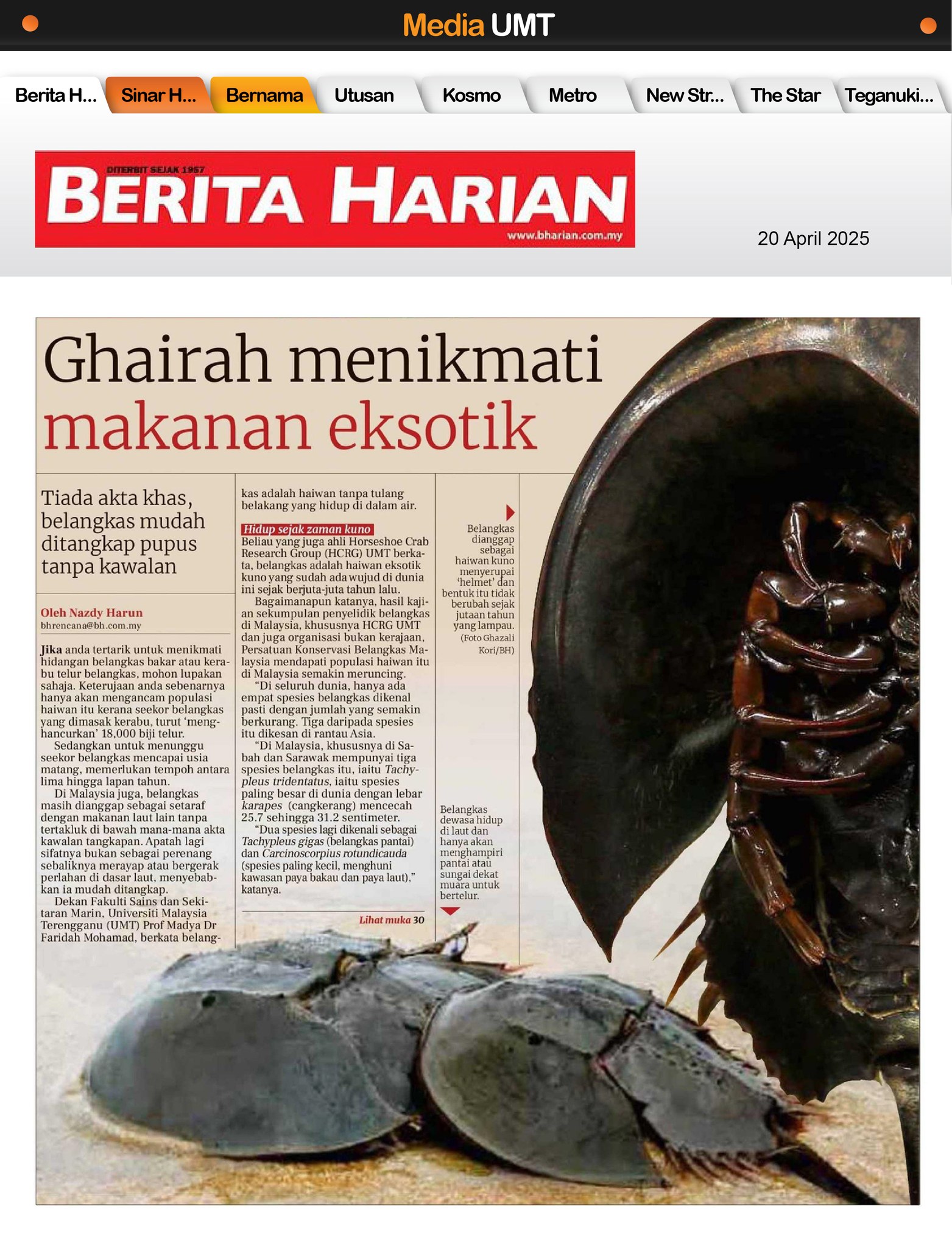 Keywords: | Belangkas Horseshoe Crab Research Group (HCRG) Eksotik Bakau Limulus Amebocyte Lysate (LAL) Faridah Mohamdd |