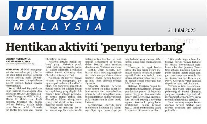 Aktiviti mengangkat dan memaksa penyu bertelur atau lebih dikenali sebagai ‘penyu terbang’ perlu dihentikan kerana boleh menyebabkan sistem fisiologi badan haiwan itu terganggu. Tindakan itu bukan perkara baharu, malah telah lama dikesan berlaku di sekitar Pantai Chendor dan Pantai Cherating, Pahang.