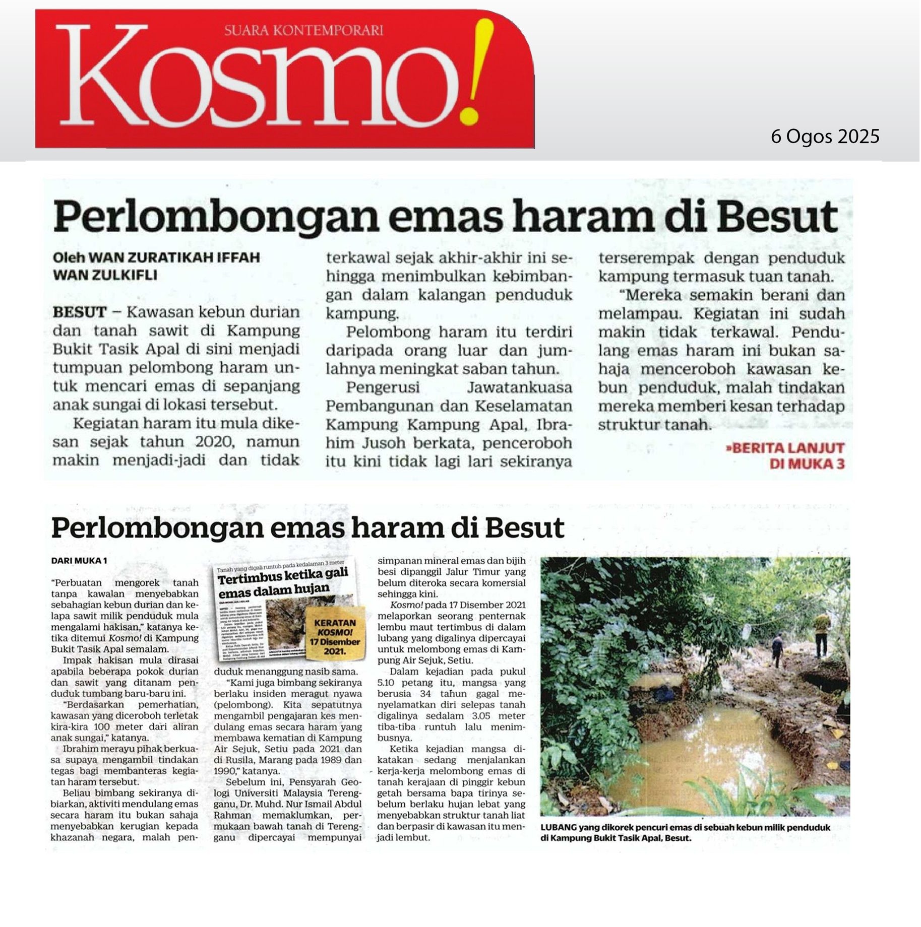 Kawasan kebun durian dan tanah sawit di Kampung Bukit Tasik Apal, Besut menjadi tumpuan pelombong haram untuk mencari emas di sepanjang anak sungai di lokasi tersebut.