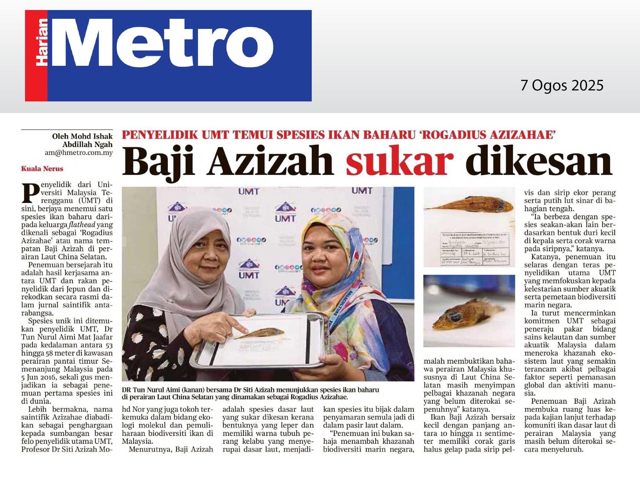 Penyelidik dari Universiti Malaysia Terengganu (UMT) di sini, berjaya menemui satu spesies ikan baharu daripada keluarga ‘flathead’ yang dikenali sebagai ‘Rogadius Azizahae’ atau nama tempatan Baji Azizah di perairan Laut China Selatan.