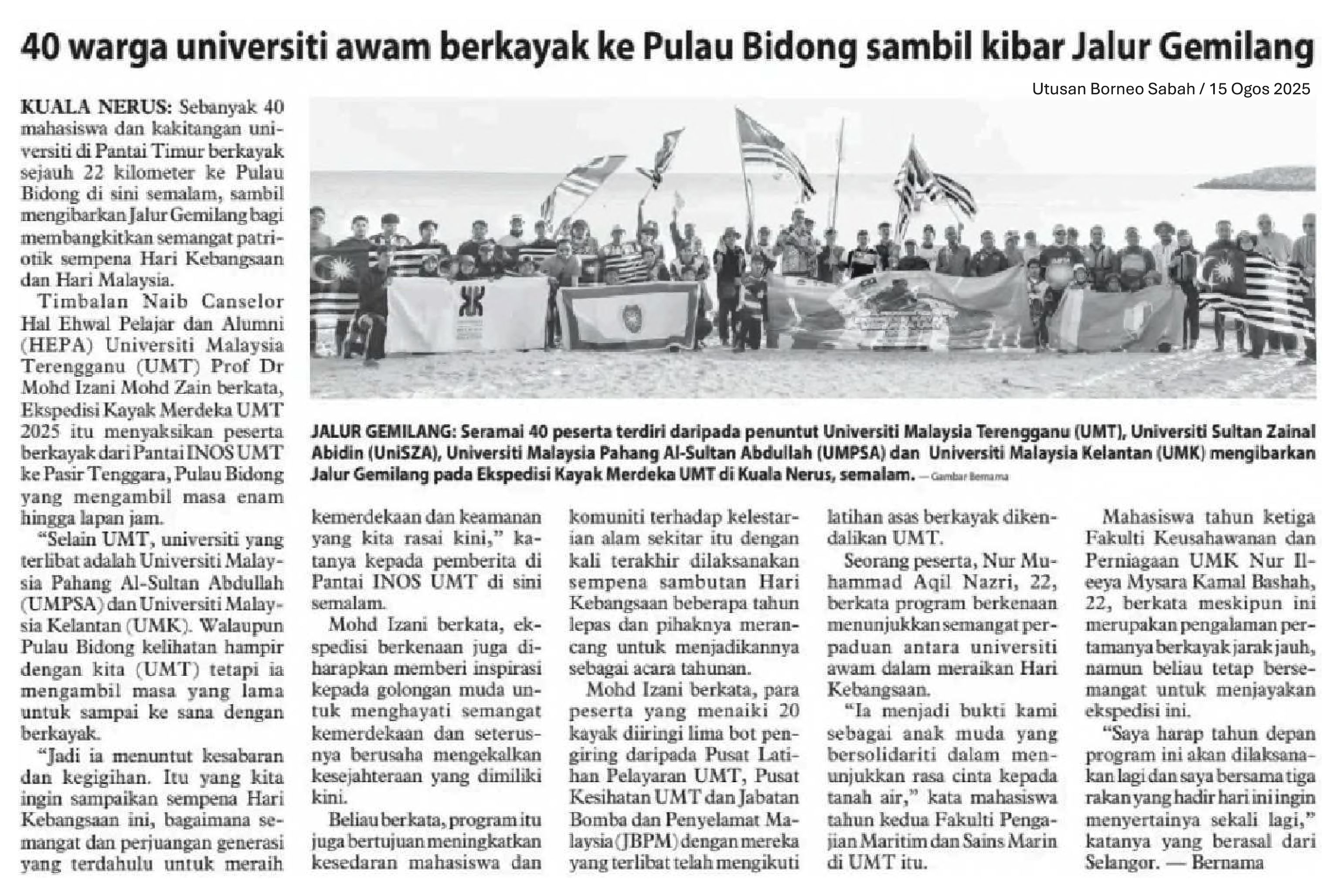 Sebanyak 40 mahasiswa dan kakitangan universiti di Pantai Timur berkayak sejauh 22 km ke Pulau Bidong sambil mengibarkan Jalur Gemilang bagi membangkitkan semangat patritik sempena Hari Kebangsaan dan Hari Malaysia.