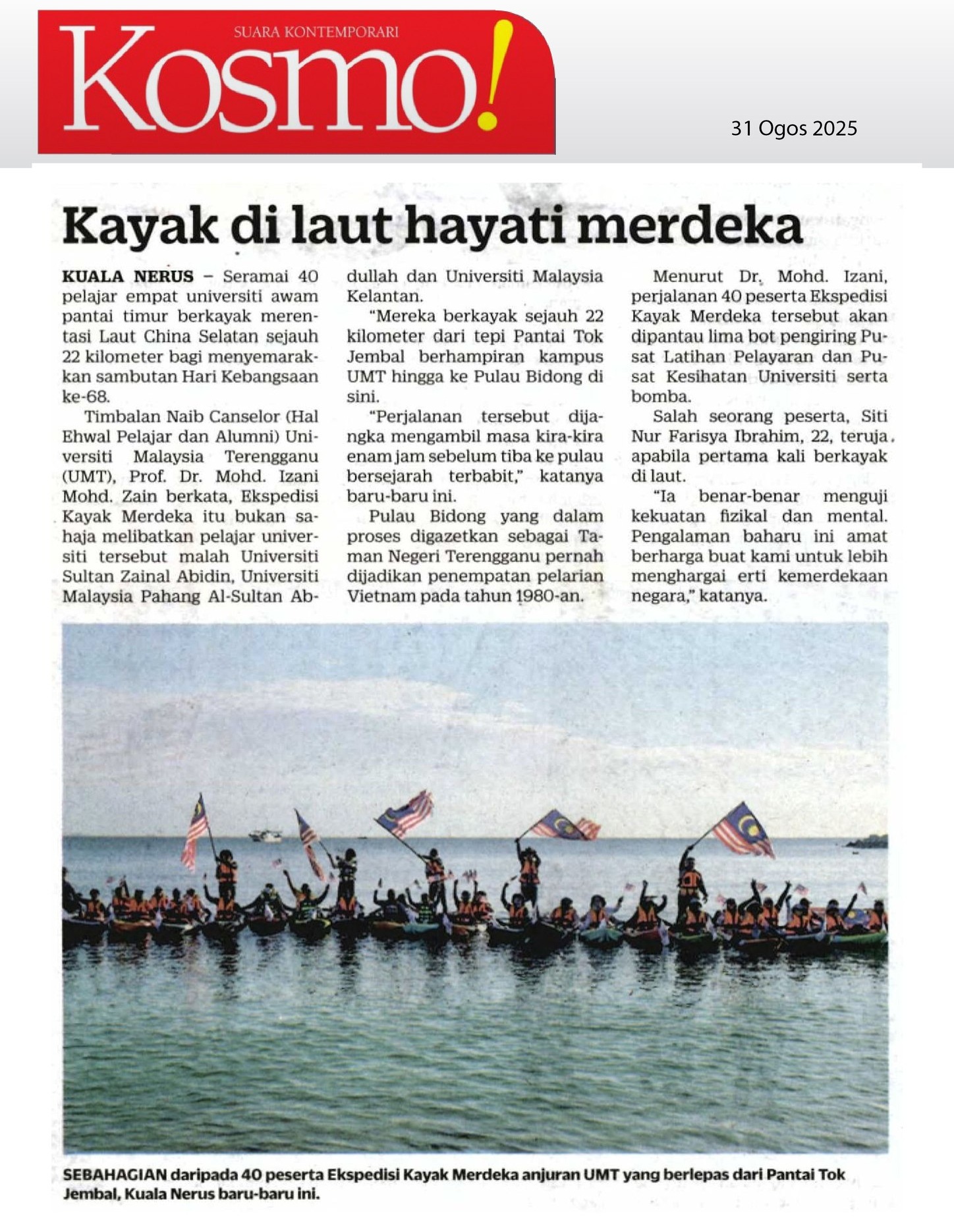 Seramai 40 peserta terdiri daripada penuntut Universiti Malaysia Terengganu (UMT), Universiti Sultan Zainal Abidin (UniSZA), Universiti Malaysia Pahang Al-Sultan Abdullah (UMPSA) dan Universiti Malaysia Kelantan (UMK) ketika menyertai Ekspedisi Kayak Merdeka UMT. Ekspedisi itu melibatkan peserta mengharungi cabaran mengayuh kayak sejauh 22 kilometer dari pantai UMT ke Pulau Bidong.