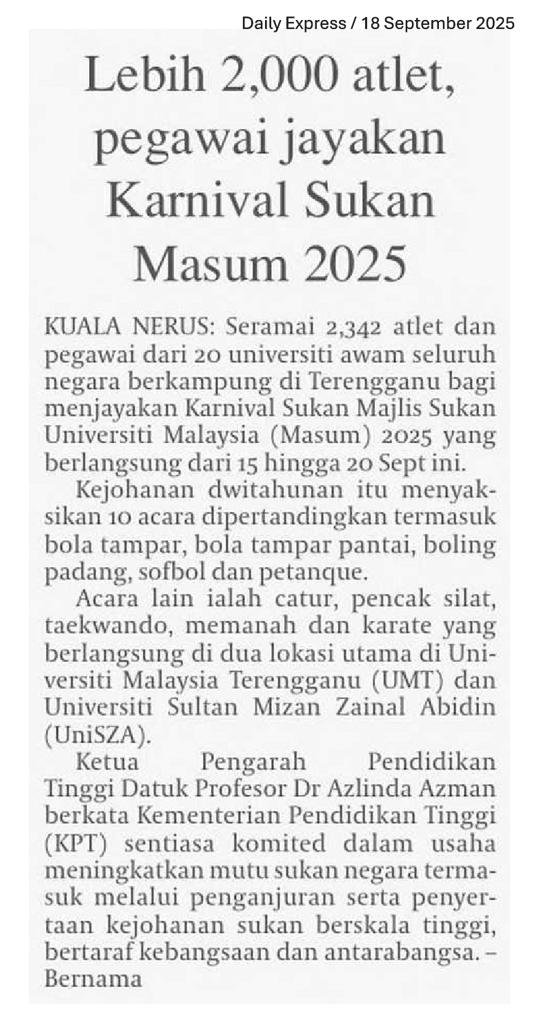 Seramai 2,342 atlet dan pegawai dari 20 universiti awam seluruh negara kini berkampung di Terengganu bagi menyertai Karnival Sukan Majlis Sukan Universiti Malaysia (MASUM) 2025 yang berlangsung dari 15 hingga 20 September.