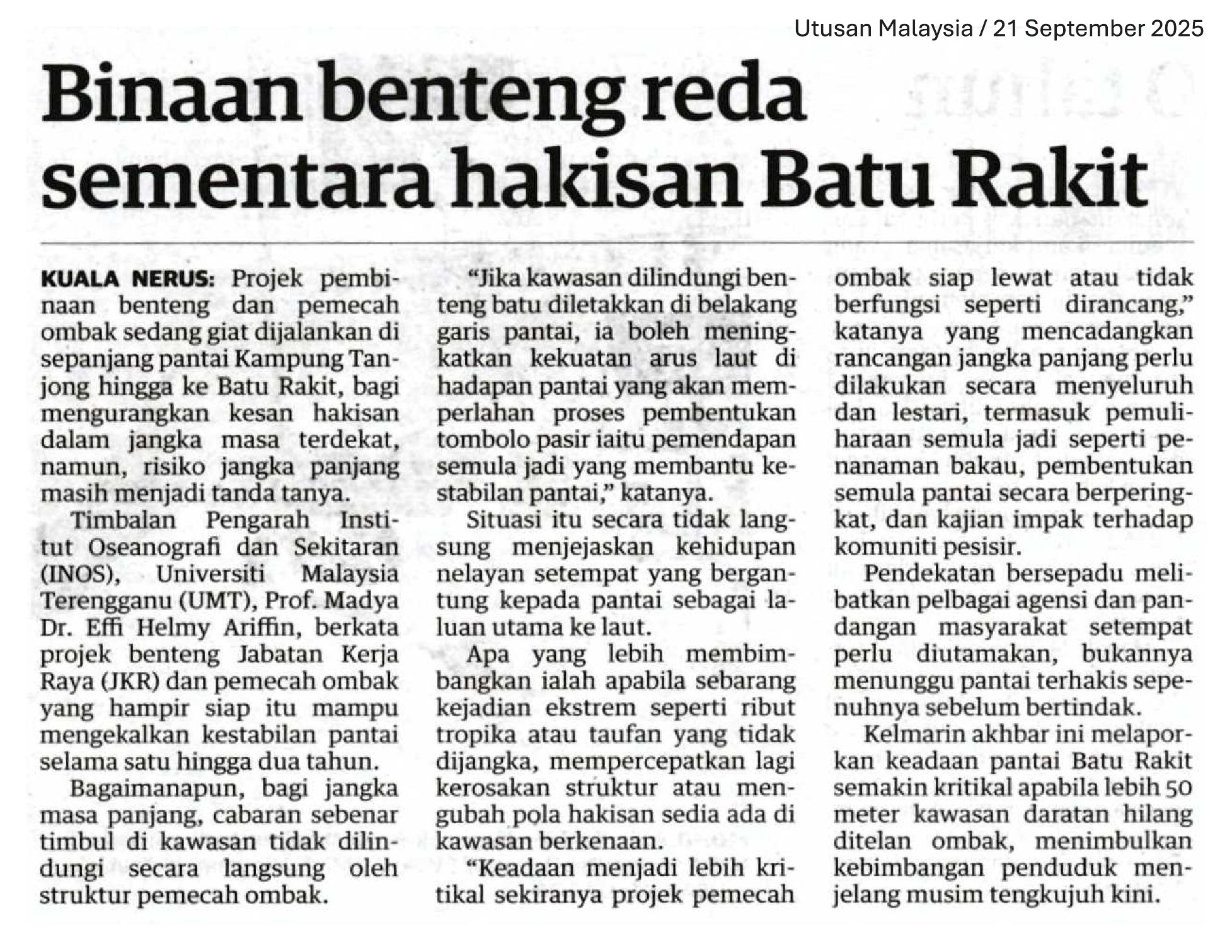 Projek pembinaan benteng dan pemecah ombak sedang giat dijalankan di sepanjang pantai Kampung Tanjung hingga ke Batu Rakit, bagi mengurangkan hakisan dalam masa yang terdekat namun risiko jangka panjang masih menjadi tanda tanya.