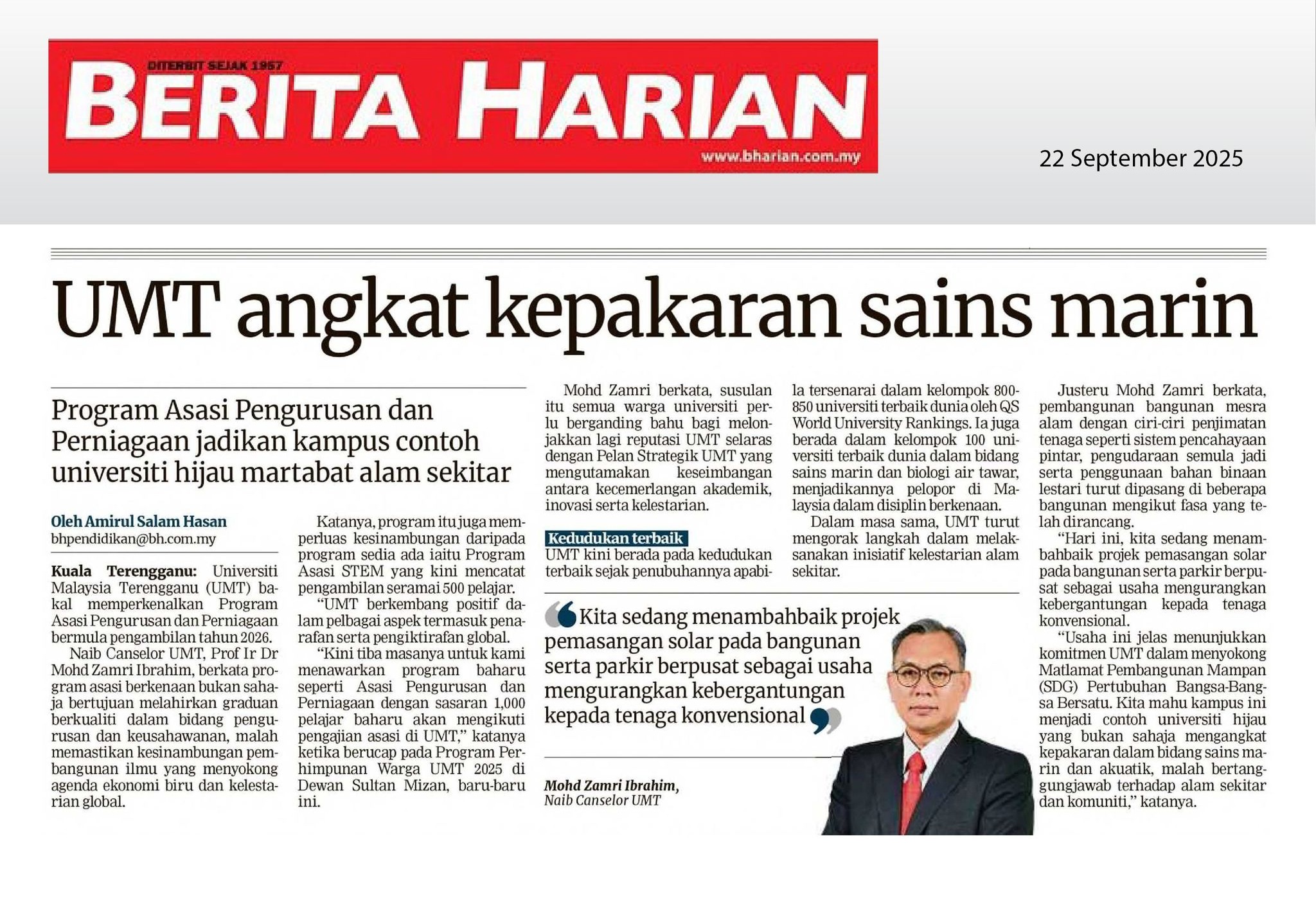 Universiti Malaysia Terengganu (UMT) mengangkat kepakaran dalam bidang sains marin melalui inisiatif akademik dan pembangunan lestari. UMT memperkenalkan Program Asasi Pengurusan dan Perniagaan bermula 2026 sebagai kesinambungan kepada program asasi sedia ada, dengan sasaran 1,000 pelajar setahun. Naib Canselor UMT, Prof. Dr. Mohd Zamri Ibrahim menekankan kepentingan keseimbangan akademik, inovasi serta kelestarian alam sekitar selaras dengan Pelan Strategik UMT.