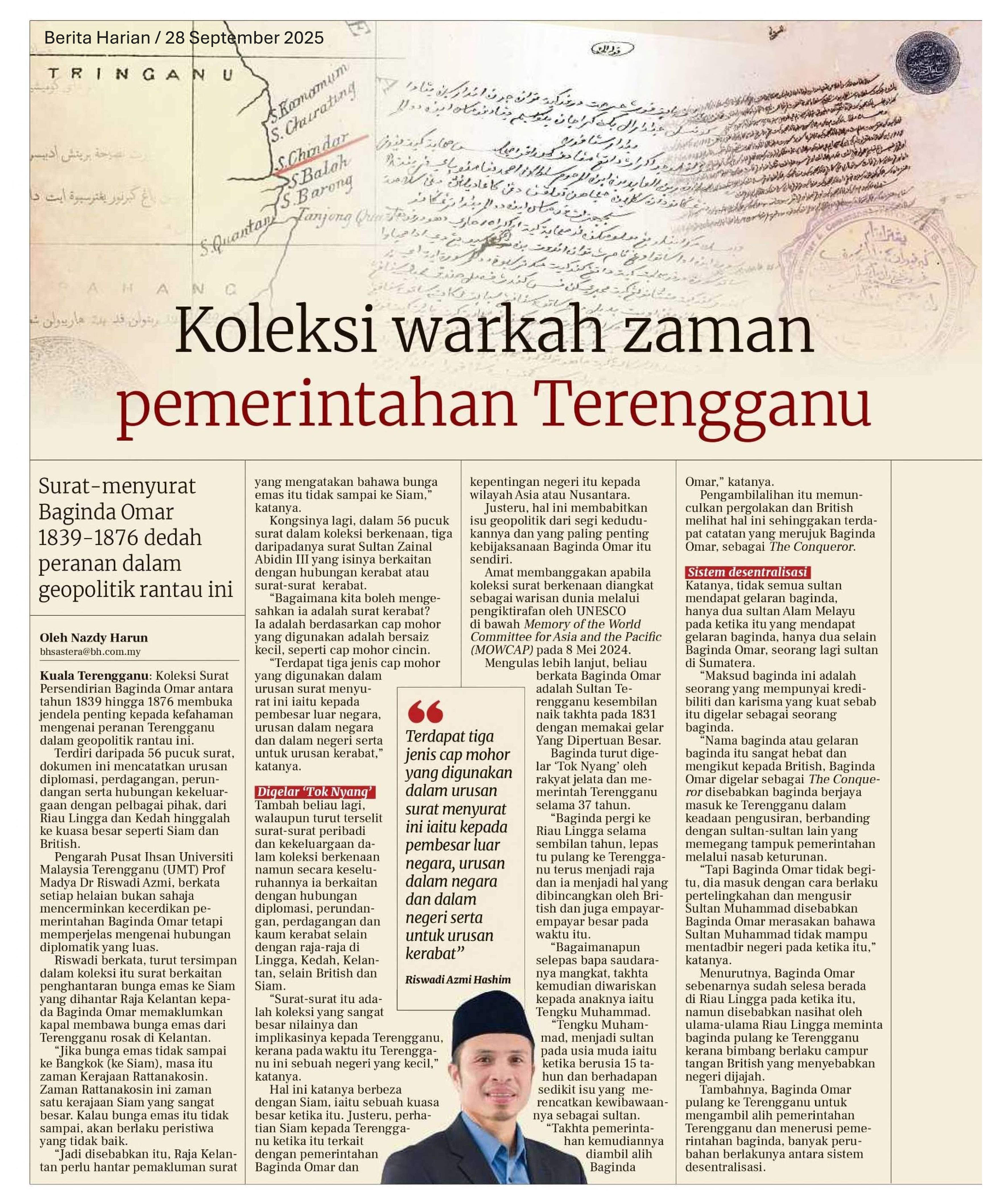 Koleksi surat persendirian Baginda Omar antara tahun 1839 sehingga 1876 membuka jendela penting kepada kefahaman mengenai peranan Terengganu dalam geopolitik rantau ini. Koleksi surat peribadi Sultan Baginda Omar (1839–1876) yang disimpan di Pusat Ihsan Universiti Malaysia Terengganu (UMT). Koleksi berjumlah 56 pucuk surat itu merangkumi urusan diplomasi, perdagangan, perundangan dan hubungan kekeluargaan, yang memperlihatkan kedudukan penting Terengganu dalam geopolitik rantau Asia Tenggara pada abad ke-19.
