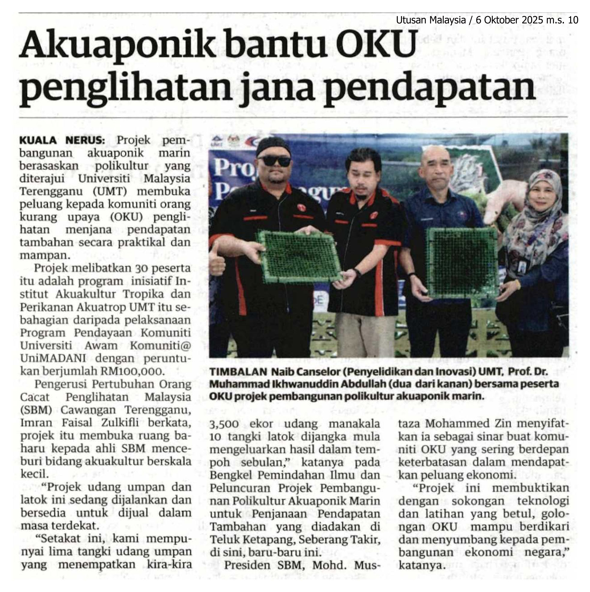 Projek pembangunan akuaponik marinnberasaskan polikultur yang diterajui UMT membuka peluang kepada komuniti orang kurang upaya (OKU) penglihatan menjana pendapatan tambahan secara praktikal dan mampan.