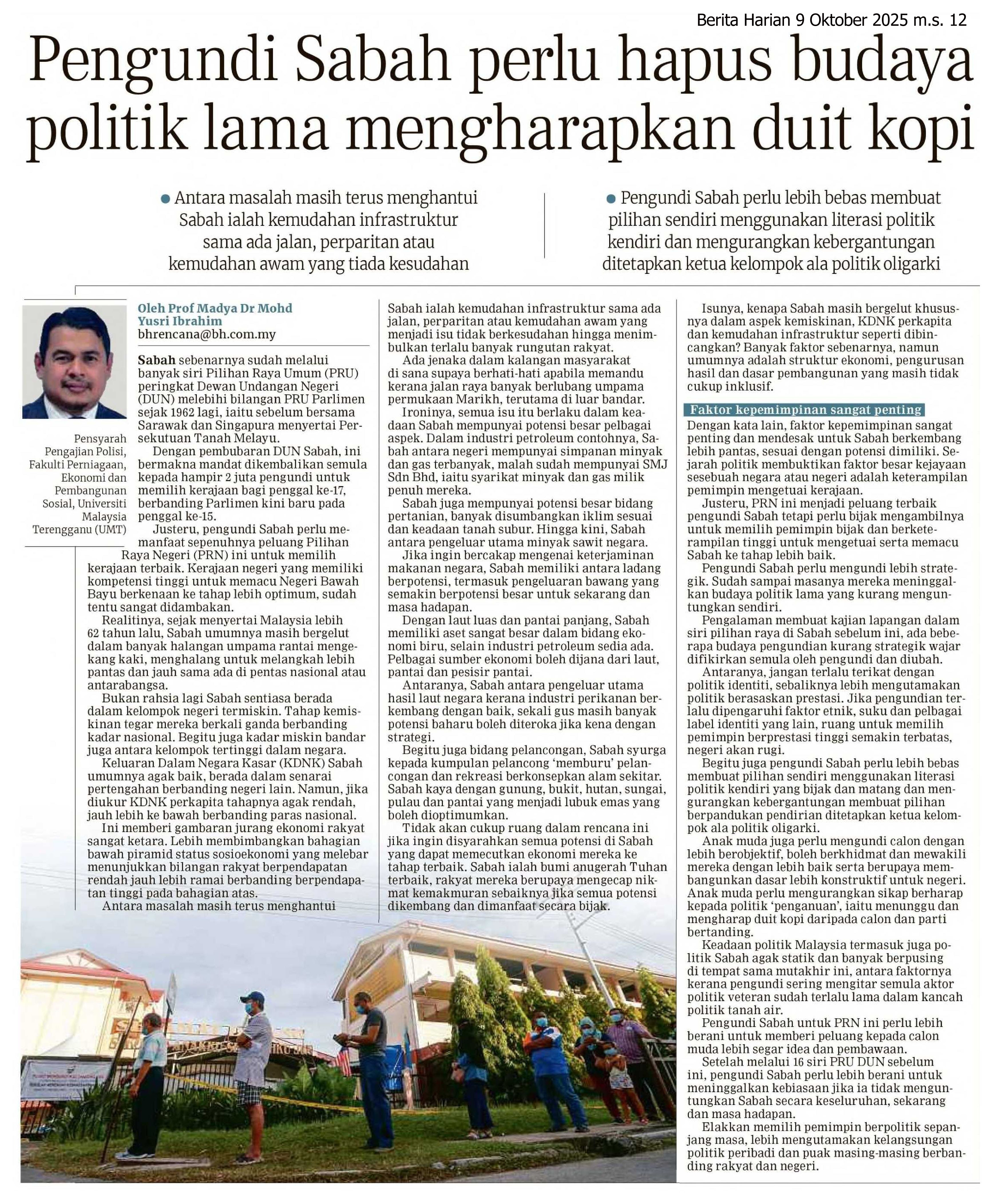 Keperluan rakyat Sabah meninggalkan budaya politik lama yang bergantung kepada “duit kopi” dan memilih kepimpinan berdasarkan kesedaran serta literasi politik. Ia juga menyentuh isu pembangunan infrastruktur, kemiskinan, dan cabaran sosioekonomi di Sabah yang berkait rapat dengan budaya politik sedia ada.