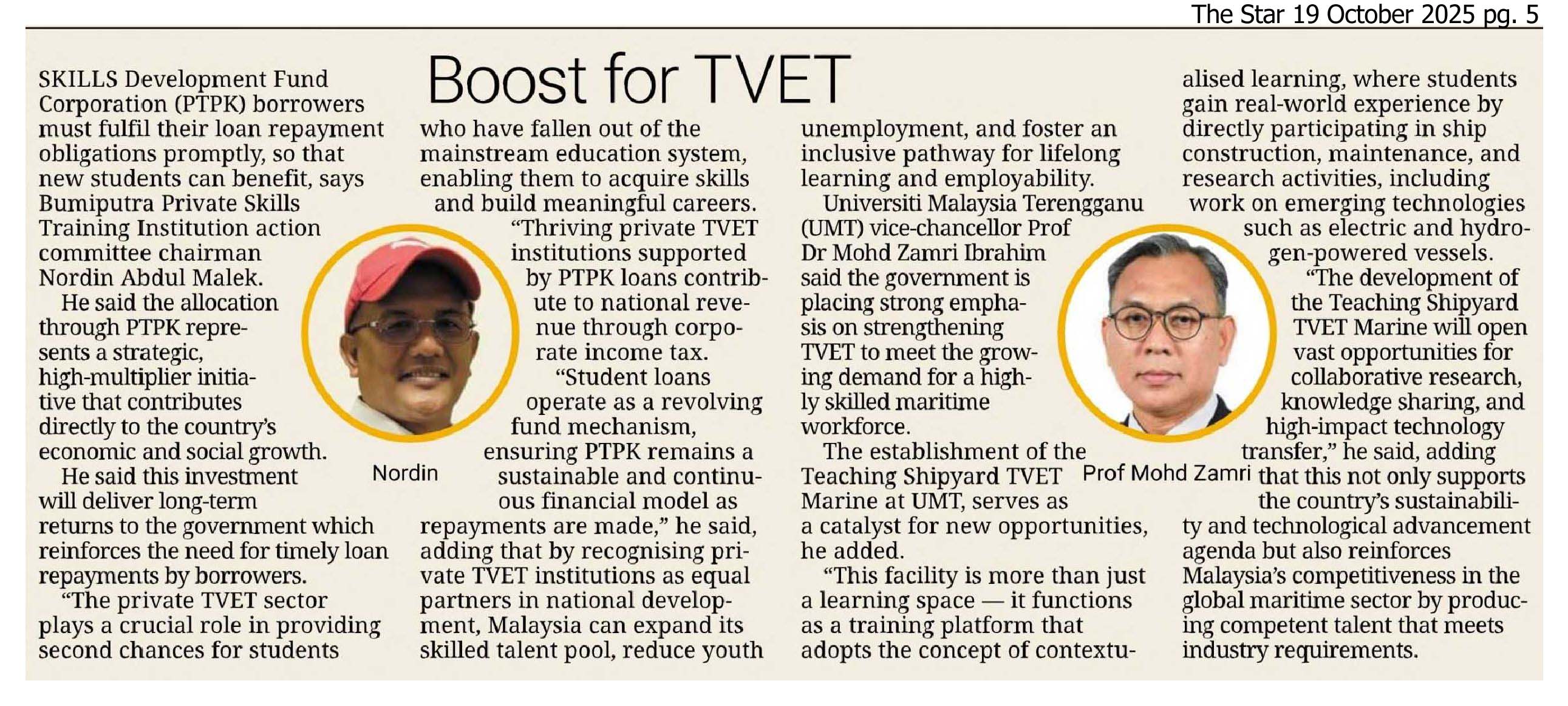 Government initiatives to enhance maritime TVET through the Teaching Shipyard TVET Marine project. This program provides contextual training in shipbuilding, maintenance, and emerging technologies such as electric and hydrogen-powered vessels. The project aims to boost graduates’ employability and Malaysia’s competitiveness in the global maritime industry.